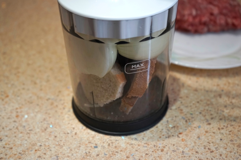 В блендер добавить лук, белый и черный хлеб, соль, черный молотый перец
