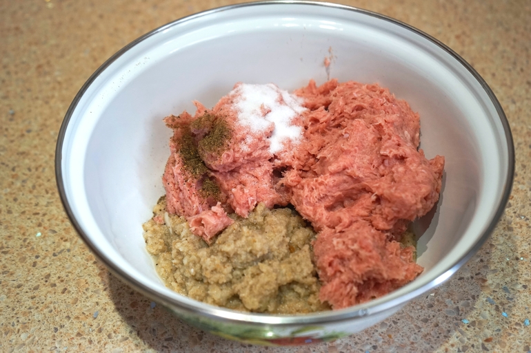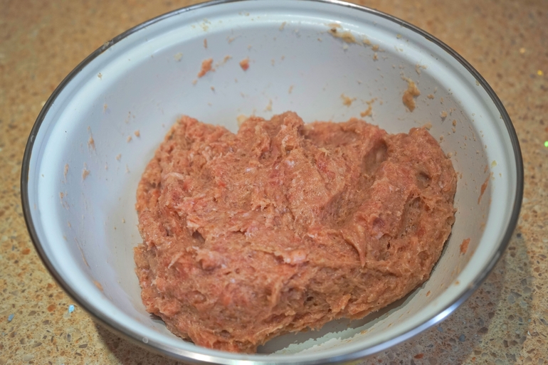 Мясной фарш прокрутить дважды на мясорубке или взбить в блендере до однородной консистенции