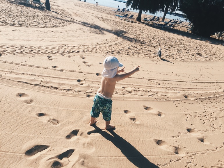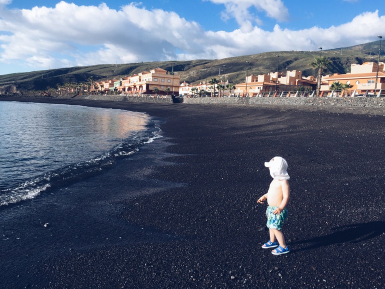 В самом Санта-Крусе нет пляжей, но совсем рядом с городом находится самый офигенный пляж острова: Las Terisitas. Это единственный на Тенерифе пляж с желтым песком. Вот испанцы чудаки, своих пляжей им оказалось недостаточно, и они приперли желтый песок аж из самой Сахары! Которая кстати от Тенерифе всего в 300 км по воде. Пляж получился очень красивый и просторный. Там самый лучший заход для деток-очень мелкий и пологий, а также волнорезы во всю длину, и вообще нет волн. И вода быстрее прогревается. Мы чаще всего ездили именно туда, Лёва с удовольствием плескался в воде).