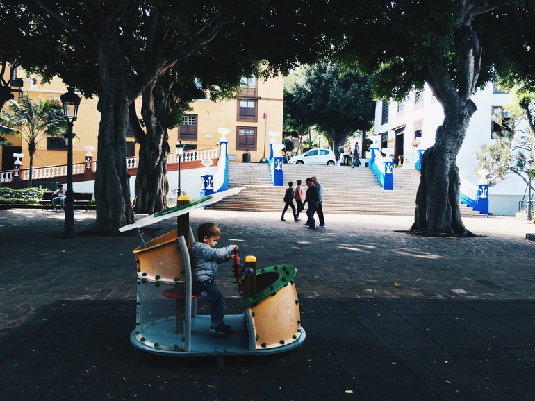И кстати, русским мамам на заметку. То есть нам с вами: там не принято приносить на площадки свои игрушки. Площадки-для того чтобы бегать, кататься, играть в подвижные игры. Вы не представляете, сколько нервов это сберегает и родителям и детям! За 3 месяца у нас ни одного конфликта на площадках. Ни одного! Тут на бб что ни день, обсуждение "площадочного срача": свое, чужое, украли, отняли, вредные трехлетки и тд. Там я вообще об этом забыла. Я не знаю что это-хорошее воспитание, или расслабленный в целом образ жизни, и не хочу идеализировать. Но ни разу за 3 мес моего ребенка старший не толкнул, не задел и тд. Старшие дети очень бережно относятся к малышам. Помогут с горки спуститься, уступят и тд. У нас даже был забавный случай, но в этом все канарцы: мы гуляли с Лёвой на площадке, и еще папа с девочкой постарше, лет 5. И не скажу что они прям вместе играли, просто рядом, на одной горке. И папа с девочкой вскоре ушли. Я думала домой, но нет, смотрю возвращаются. Девочка бежит, во рту конфета на палочке, в руке еще одна. Бежит и дает конфету моему Леве. Меня это так тронуло! То есть папа пошел с дочкой в киоск, и подумал о том, что другому малышу тоже захочется конфету. И самое грустное, что меня как русскую этот простой жест удивляет. Хотя это же нормально!