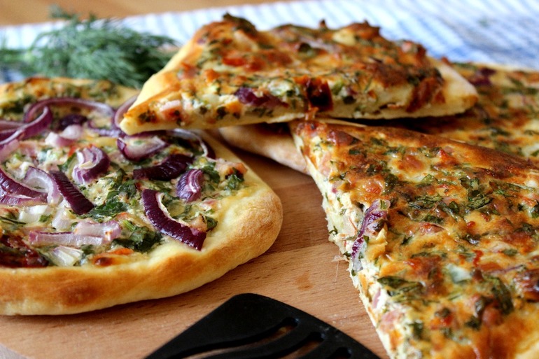 Тесто делим на 4 куска. Раскатываем тонко. Переносим на противень с пекарской бумагой. У меня на 1 противень помещаются 2 фламмкухена. Делаем у теста небольшие бортики. Выкладываем на каждый кусок теста начинку.