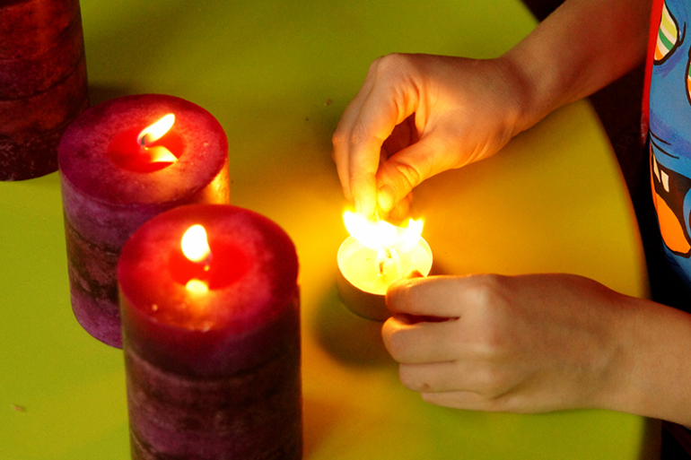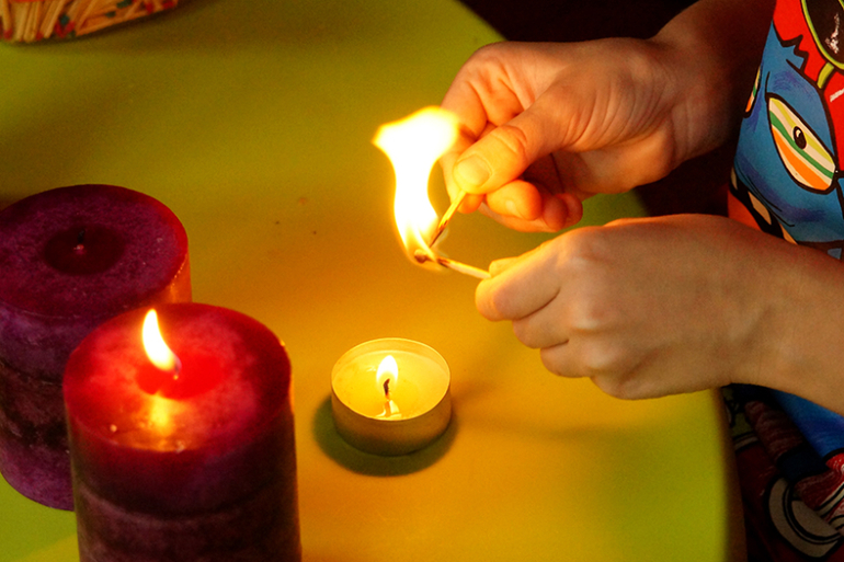 Минут 30 Артем просто играл со спичками. Зажигал. Тушил. Снова зажигал. От свечи, от спички, об коробок. Сказал мало свечей и принес еще)))