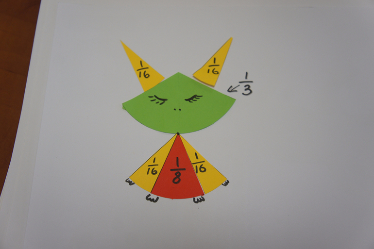 Нужно, разрезав круги на части, сделать аппликацию. А потом посчитать сколько целых кругов и сколько частей было в ней использовано.