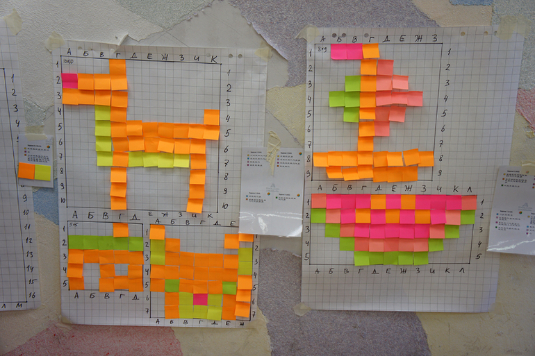 Получаем задание, выбираем цвет, ищем координату и приклеиваем цветной квадратик. На выходе получается картинка. Заданий несколько, поэтому у кого что получится неизвестно)))