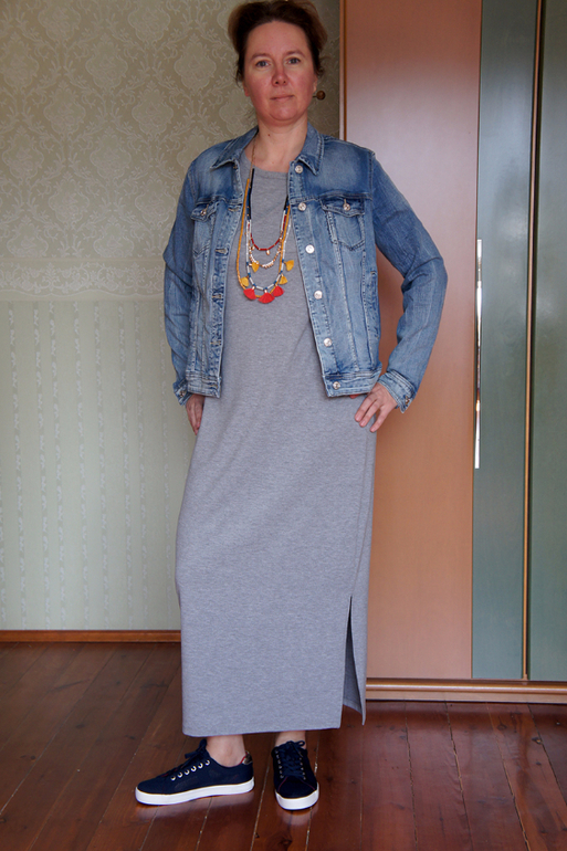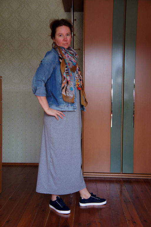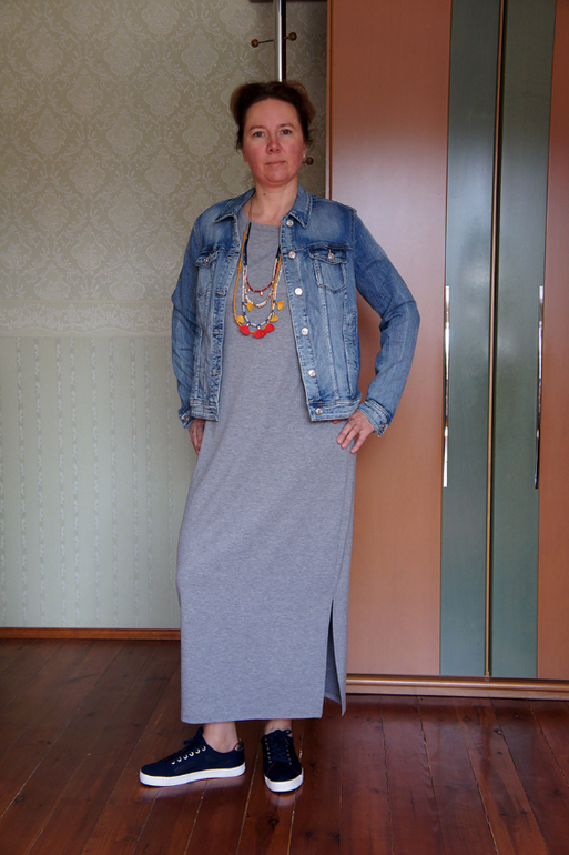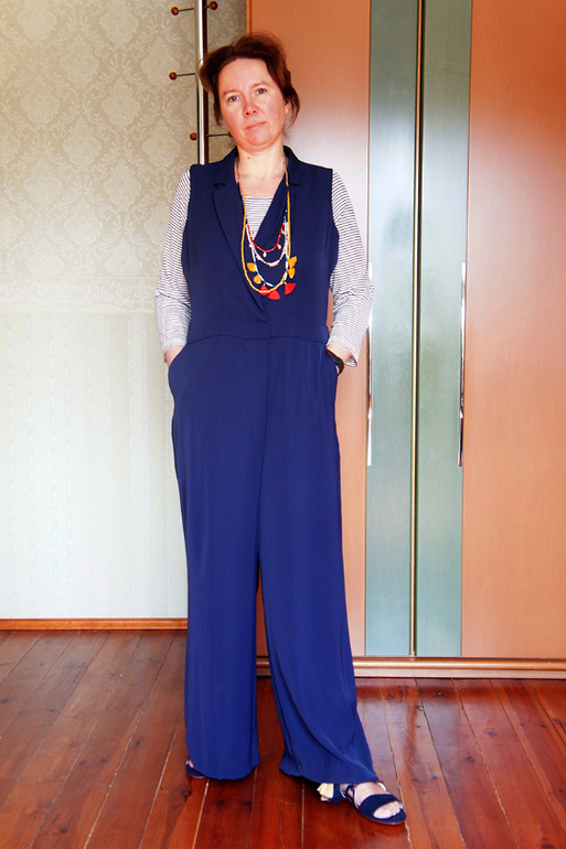 Комбез...в штанины еще 2 тебя влезет, может их ушить... и мне просится тут пояс. Бохо колье ни к селу тут. С джинсовкой не понравилось. Может попробовать его в морском стиле обыграть с тельняшкой.