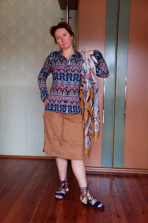 Рубашка не понравилась, слишком много цветов намешано, смотрится оляписто. В консультации подобного плана блузка не такая яркая, и орнамент идет вертикальный, что зрительно вытягивает фигуру. В купленной тобой орнамент горизонтальный, хотя с твоими формами сейчас и эта блузка фигуру не портит.