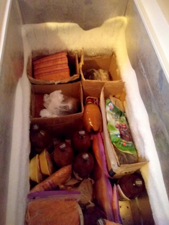 Вытащила всё на террасу на улицу, разморозила холодильник (горячей водой всё смыла), помыла, сложила всё обратно аккуратно. Проверила запасы, завтра в Глобус поеду.