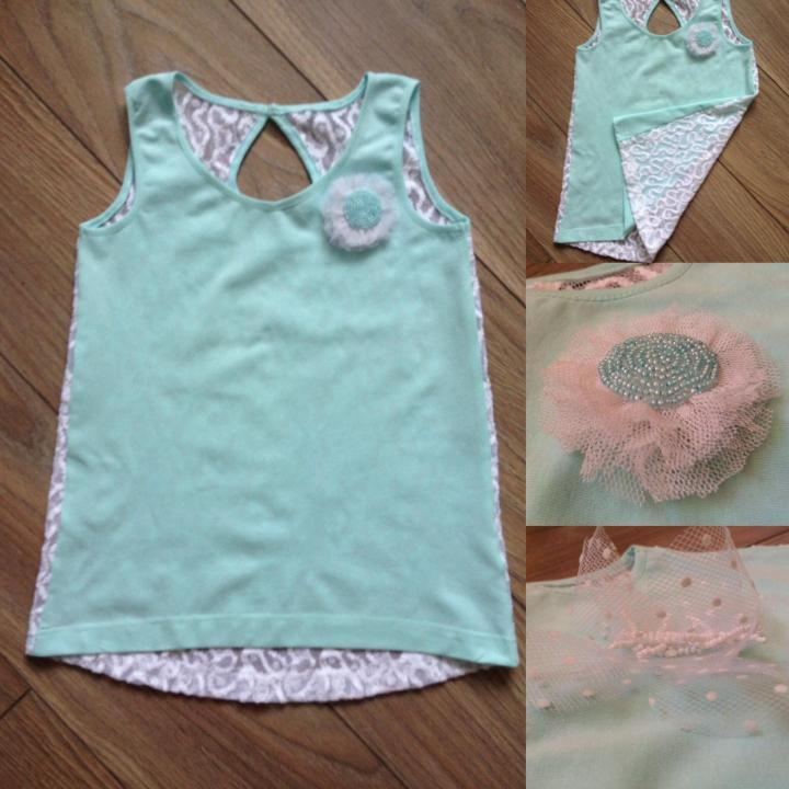 Туника-майка с кружевной спинкой. Нежный цвет ментола. Хлопковый мягкий трикотаж. На спинке вырез капелькой с маленькой пуговичкой - очень мило. Есть готовая работа на рост 110-116 и на рост 116-122. Что удобно в такой тунике - этим летом у Вас туника, а следующим - милая маечка.