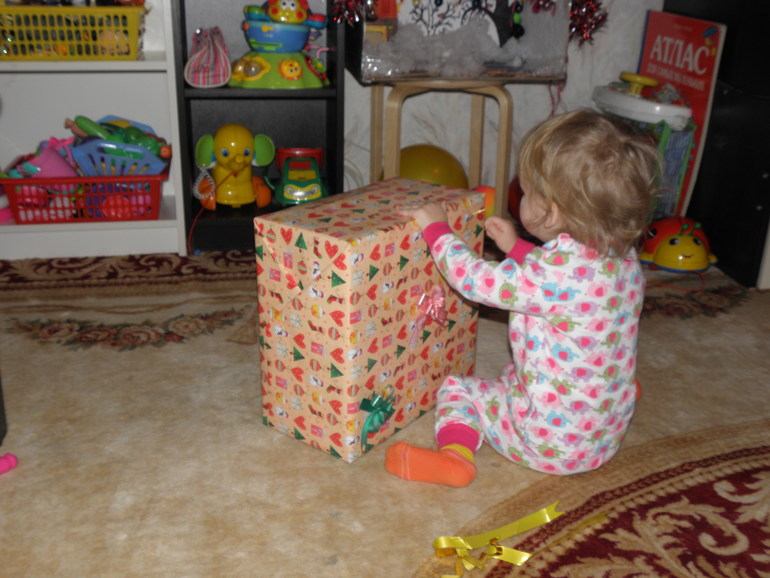 Новый год мы встречали вдвоем с мужем, Катя спала после всех новогодних приключений и не один салют ее не побеспокоил. Проснувшись утром Катя прям в пижаме принялась разворачивать свой подарок)