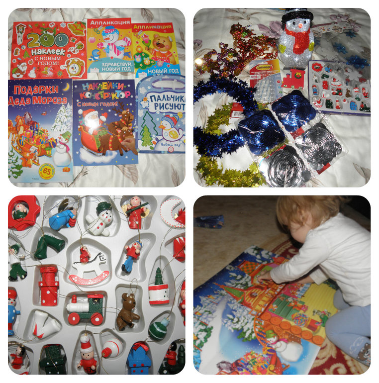За 10 дней до НГ я повесила новогодний носочек и это был адвент для Кати, туда я клала разные подарочки и задания. Положить все сразу в разные коробочки я не рискнула т.к. терпения у ребенка нет)