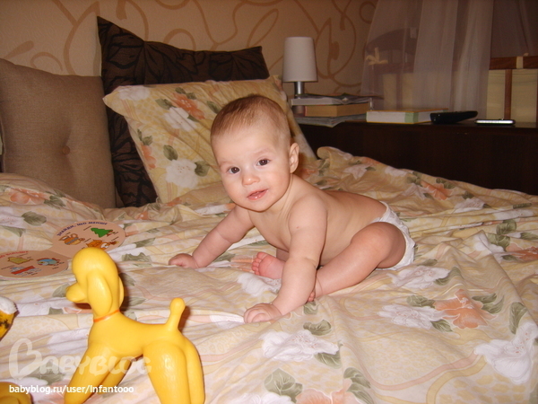 На фото - это она с живота, точнее стоя на четвереньках как то умудрилась сесть, а сегодня лежала на спине когда села=))) И ваш малыш скоро вас порадует своими умелками=))))
