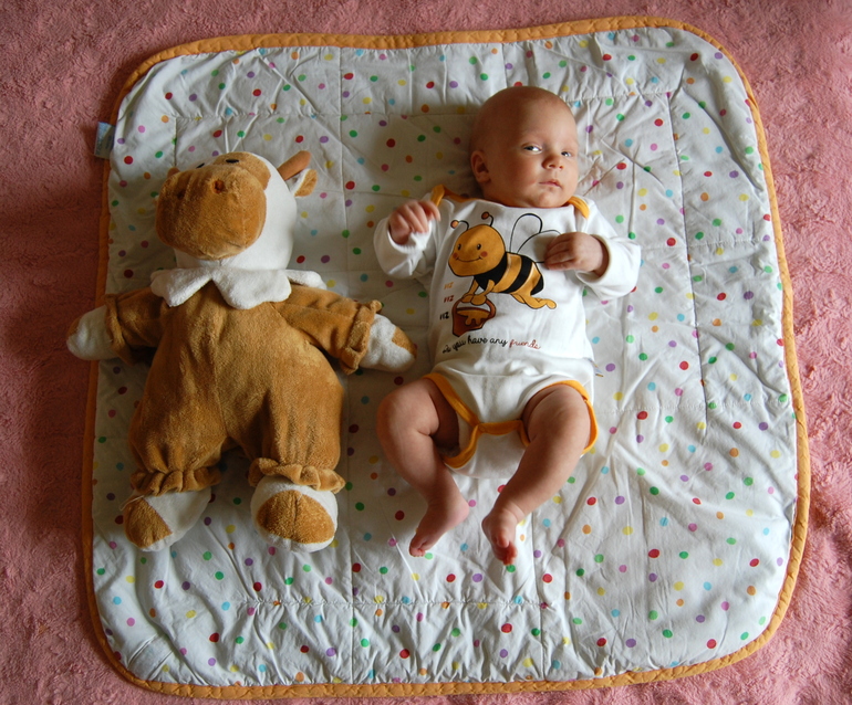 Голову тоже держит уже прилично, но лежать на животе соглашается совсем недолго.