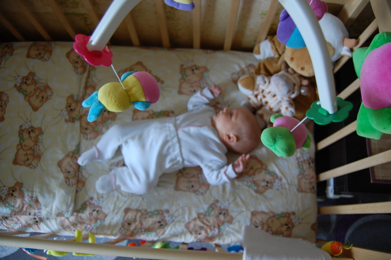 Следит за игрушками на мобиле и погремушкой, ну и за мамой тоже))