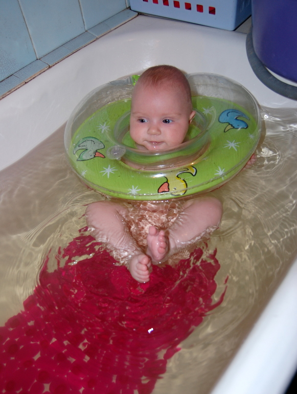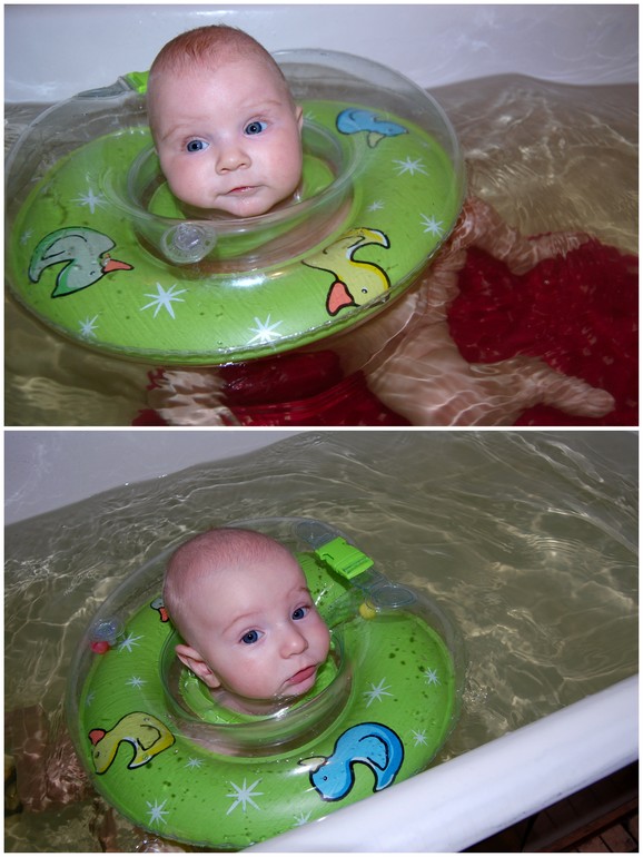 Купаемся в круге, стала очень активно вертеться-кружиться в воде, забавно висит поплавком на круге.