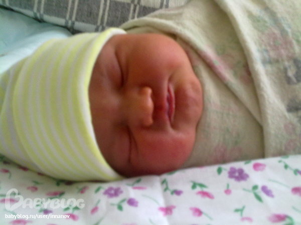 ну вот значит....родились мы на 38ой неделе в 5-30 утра, с весом 3300 и ростом 52 см. Правда нашему папе я смс отправили что 56 см)))) Я вообще чудная после родов была))) Всё никак уснуть не могла.... Принесли мне моё чудо, а я глаза выпучила и не знаю как к ней подходить и за какое место брать))) Хорошо в палате девушка оказалась, у неё уже второй ребёнок, так она мне всё и подсказывала. Мы до сих пор с ней дружим. Она про меня говорит что я сумашедшая мамашка)))))