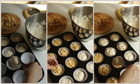 Теперь бумажные капсулы вставляем в железную или силиконовую форму и наполняем на 3/4 тестом.