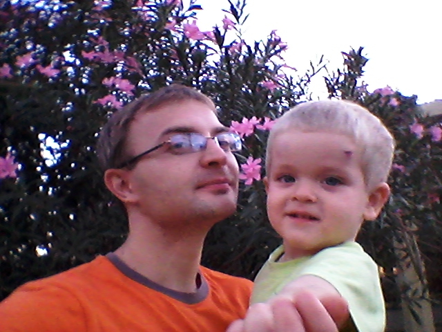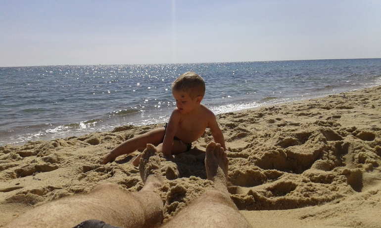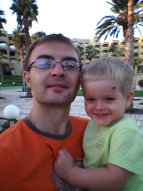 Были довольно трудные(в организационном плане)моменты,которые Даня героически перенес.Например,я их очень тщательно готовила к поездке,собирала все необходимое,но совершенно забыла о том,что по прилету им нужно будет заполнять бумаги.Муж был ошарашен еще и тем,что они были только на арабском и французском языках!Спасибо сотрудницам аэропорта-женщинам,что помогли Дане с Ариком и сотрудникам-мужчинам,которые в итоге махнули на все рукой и положили конец этой писанине!Гид тоже подвел в день встречи.Оказался субъектом из ленивых(бывает).Да еще и Арик ночью забыл,что спит на новом месте,спрыгнул с кровати и пошел на скорости прямо в тумбочку...В итоге рассек лоб и был намазан зеленкой.Вообще просыпался в первую ночь каждые 2 часа,проверял папу,озирался кругом.Окончательно встали они в 8.45.Но я не хочу тратить половину поста на негативные моменты.У них-то на самом деле хорошего больше.Да и времени еще прошло мало.Даня в восторге от местного сухого вина,Арик в восторге от кошек,живущих на территории гостиницы!)))Днем у них +30,а ночью где-то +26!Вода +25.Муж сказал,что она реально теплая,в море хорошо.Я дико рада за них.А сама сейчас кутаюсь дома в плед и мерзну.Кот служит дополнительным источником тепла.Ребята мои там уже и в магазин прогулялись.За детской водой,с которой там дела обстоят проблематично.От дневного сна ребенок отказался,все ему интересно,все нужно успеть.Хвалят еду в гостинице,для ребенка ассортимент достаточный.Мы ведь Арику и не брали туда ничего,кроме упаковки каши,зная его аппетит.Шлют мне фото в течении дня!))Такие умильные.В самолете к месту назначения Арик тоже вел себя достойно.А я очень переживала за этот момент.Он не плакал,не ныл,не кричал,а только скакал у мужа по коленкам(замесил всего бедного)и возле кресла,так как не может долго сидеть на одном месте.Перед началом полета вызвал к себе стюардессу,так как нажимал на все кнопки,которые попадались ему на глаза!)))Половину полета спал и ел.а потом еще спал во время трансфера до гостиницы.Вообще муж решил на отдыхе режима нашего не придерживаться,да и разница с Москвой там -3 часа.Я его в этом вопросе поддержала.Пусть делает все в соответствии с обстановкой.А,еще сейчас один момент вспомнила.Обжоркин-то наш в аэропорту заметил девочку с поильником и начал требовать "вкусняшку" себе!Пришлось мужу доставать дежурную "Фрутоняню",чтобы избежать "катастрофы".А вот несколько фото: