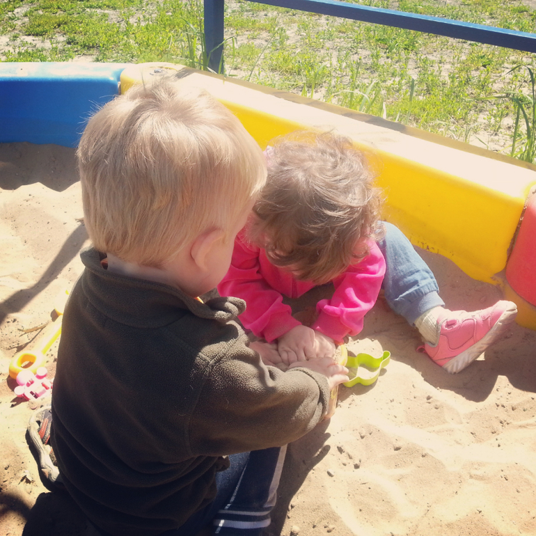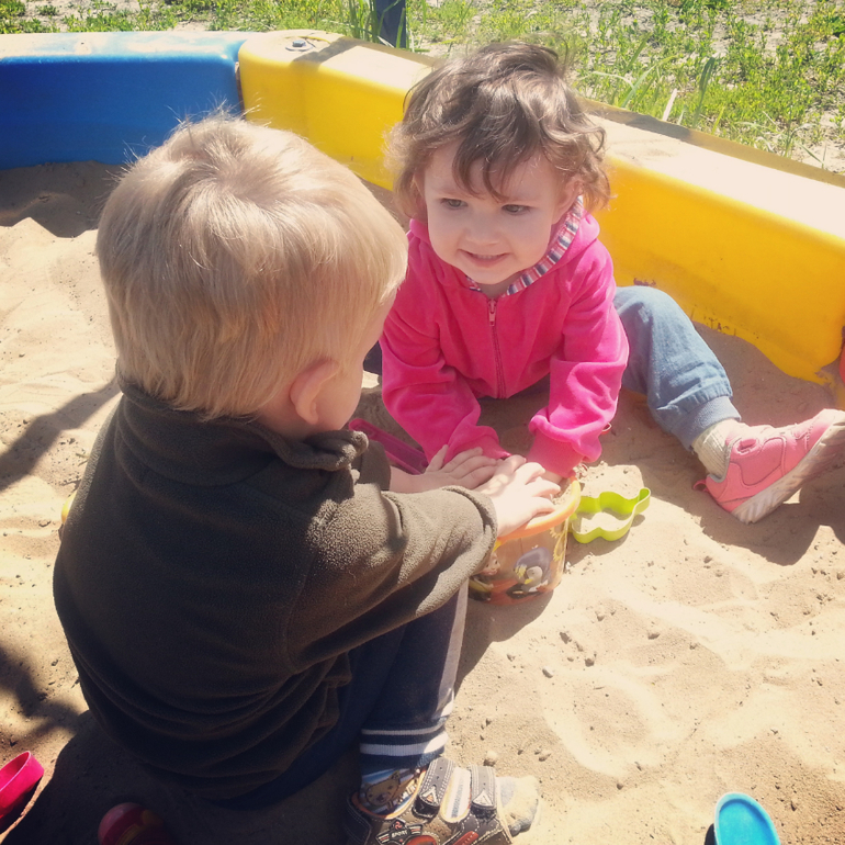Ну и я ее попыталась как-то расслабить,вывалив в песок наши игрушки.А вот мой действительно принялся Тане помогать!Ничего отнять особо не старался,если что,то уступал!У меня прям глаз радовался.И руками они вместе песок в ведре месили,и в два совка его наполняли,и взглядами обменивались.Ох,такая я довольная была!Мы ведь не всегда так себя ведем