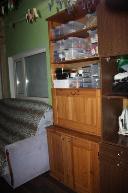 Балкон разгребла. Холодновато там, правда, но зато теперь почти все вместе. И швейная машинка, и спицы-крючкми, и пряжа. Осталось только еще ткани переместить. Но это уже завтра.