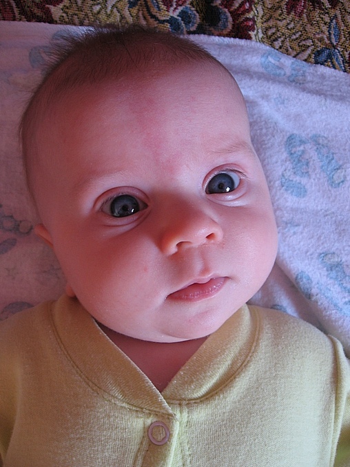Два месяца и два дня тому назад появилась на свет наша чудесная и самая любимая девочка Дарьюшка. Родилась с весом 3890 граммов и 52 сантиметра ростом. Ещё в роддоме получила прозвище Ля за то, что привлекала к себе внимание громким звуком "ЛЛЛЯЯ" в разных тональностях. За первый месяц Дашенька набрала целый килограмм, а послезавтра мы идём в поликлинику на очедное взвешивание. Сейчас Даша кроме "ЛЛЛЯ" издает всякие другие звуки, в том числе и на французский манер "ЛЛЛЁ". Девочка вкусно пахнет, любит молочко и купаться. По утрам приветствует папу и маму радостной улыбкой, умеет размахивать руками и ногами, недавно начала стучать по погремушке, если расположить её в зоне досягаемости, трогает лица мамы и папы. Ещё умеет крутить дули. При выкладывании на животик голову поднимать лениться, вместо этого засовывает кулак в рот и самозабвенно его смокчет. Вместо кулака всегда стараюсь предложить малышке грудь, но бывает она кулак и вместе с грудью пытается заглотить и сразу после кормления. Думаю, просто малышка нашла свои ручки и пытается опробовать их "на зуб". Хотя должна заметить, что последние пару дней кулаков и пальцев стало гораздо меньше. А вчера у девочки был первый заплыв в большой ванной с кругом для младенцев. Юная морячка выглядела ошеломлённой, но по началу явно получала удовольствие от процесса. Потом, видимо, девочка устала и расплакалась. Зато очень быстро и сладко уснула. По ночам Дашень спит хорошо, только просыпается несколько раз за ночь, чтобы подкрепиться. И потом ещё спит пару часов днём на прогулке. Практически всё остальное время дня девочка бодрствует. В общем, с появлением крошки наша жизнь стала интересней. Дальше буду писать про новые достижения нашей дочурки и может быть немного про житие нашего семейства.