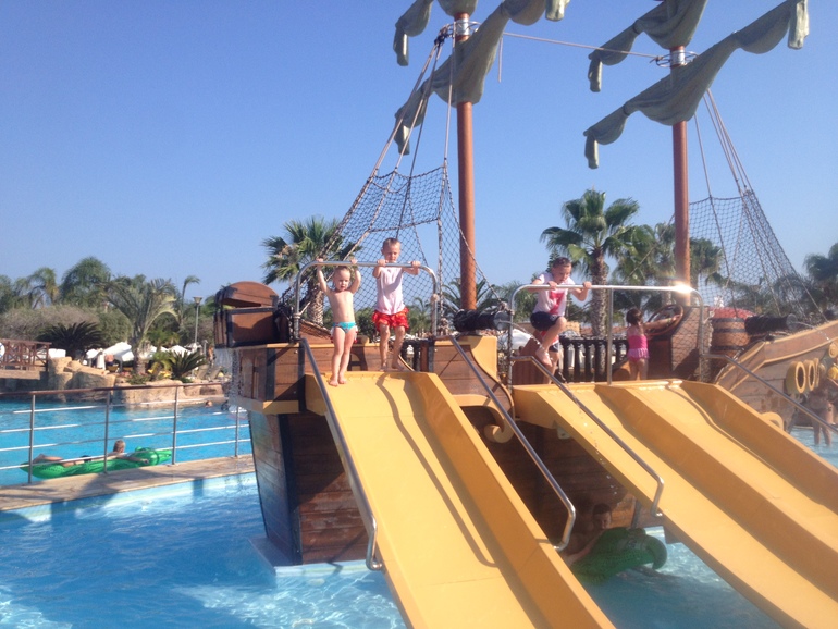 На территории - элементы аквапарка: в детском бассейне - пиратский корабль, из которого бьют фонтаны, водяные горки и все такое, есть ещё "ленивая речка" с течением, по которым катаются на надувных восьмерках и бубликах, отдельный бассейн для взрослых, куда не пускают малявок, и для подростков. Поэтому почти каждое утро начиналось с препирательства с детьми после завтрака, которые не хотели идти на море, а хотели торчать в бассейнах.