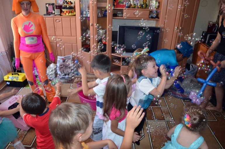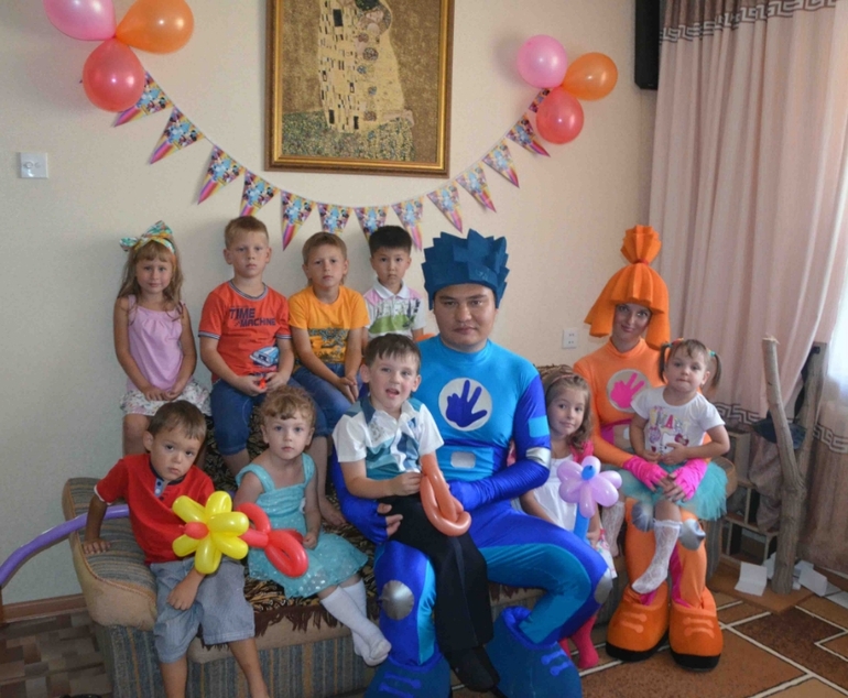 Полтора часа они развлекали наших детей. Были различные конкурсы, шоу мыльных пузырей и в завершении праздника детям были подарены фигурки из воздушных шаров. Любуйтесь сами: