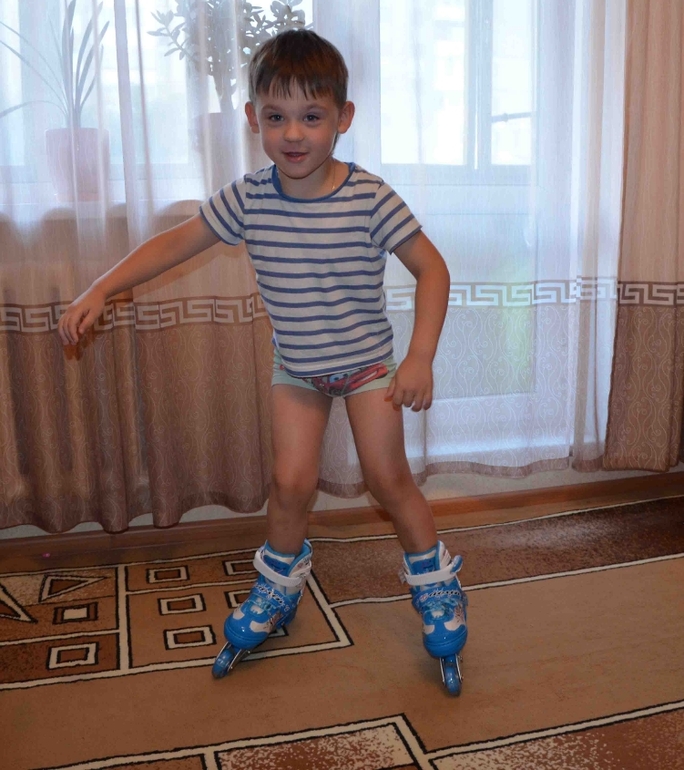 Подарки были разные... И игрушки, и деньги и вещи. Мы подарили сыну ролики. Вот он с утра, еще сонный, но уже на роликах)))