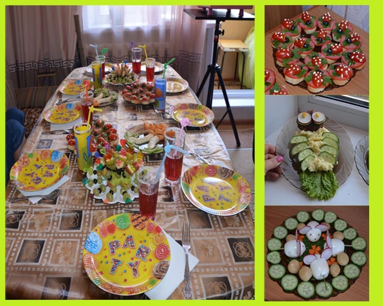 Стол тоже хотела сделать как можно более детским, сказочным)))) Готовила бутербродики в виде божьих коровок, вареные яички в виде мышек, на горячее были куриные котлетки с картофельным пюре в виде совы. Смотрите сами:
