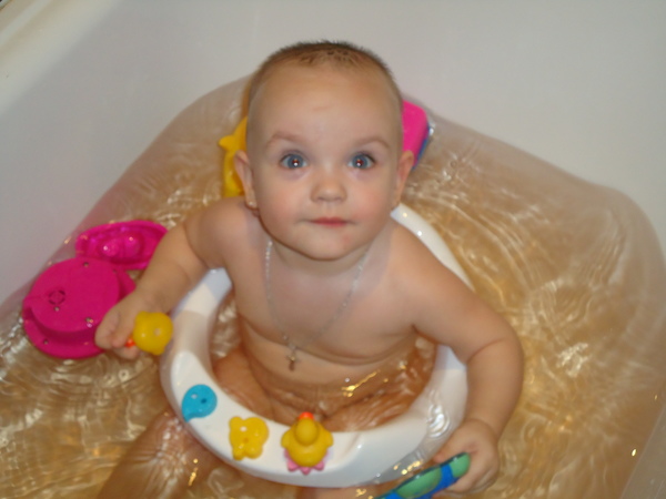 23 декабря испробовали круг для купания. И, скажу я вам, доче очень понравилось! Сначала была насторожена, но потом расслабилась и стала бултыхать ножками. У моей мамы титан и горячей воды не хватает чтобы набрать полную ванну, поэтому плавали в детской ванночке. Смотрите сами: