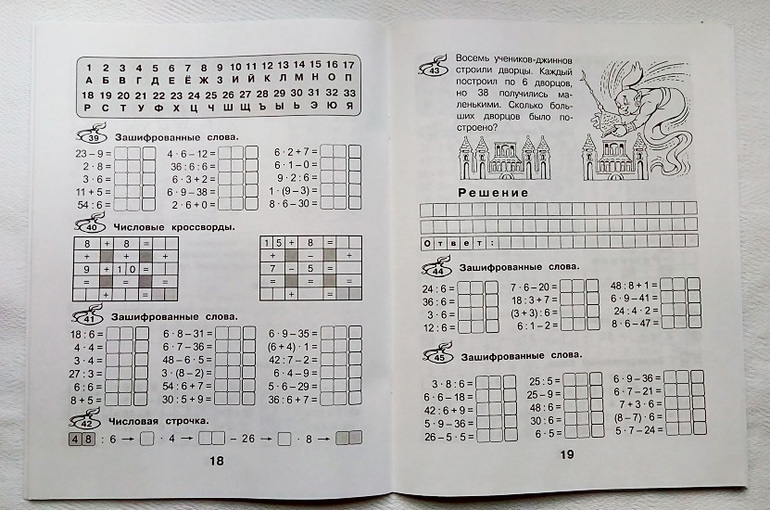 В пособии пять видов заданий, которые решают в своей школе джинны: расшифровка слов, числовые кроссворды, числовые строчки, интересные примеры и магические квадраты. Ну и, конечно, же веселые задачки: "Чтобы работать быстрее, 7 джиннов стали восьмирукими. Сколько всего рук стало у джиннов?" или "Неуклюжий джинн учился нырять в кувшин. 9 раз он попал в него, а в 9 раз больше - промахнулся. Сколько всего раз джинн нырял в кувшин?"