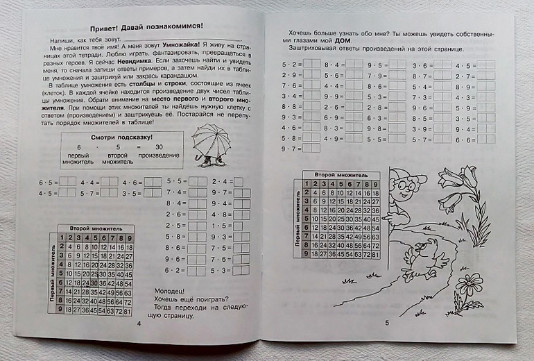 Все задания одинаковые, но это не значит, что их скучно выполнять. Тут решающую роль играет текст. В первой таблице нам предлагают "нарисовать" портрет Умножайки, который с нами общается, во второй - его дом, в третьей - транспорт, на котором мы отправимся в путешествие, а далее уже само путешествие, в котором будет много-много всего интересного.