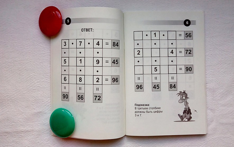 Для каждой головоломки есть подсказка, с которой стоит начинать решать. Ответ на головоломку находится на обратной стороне листа. На фото на левой странице ответ на головоломку 7, на правой - головоломка 8.