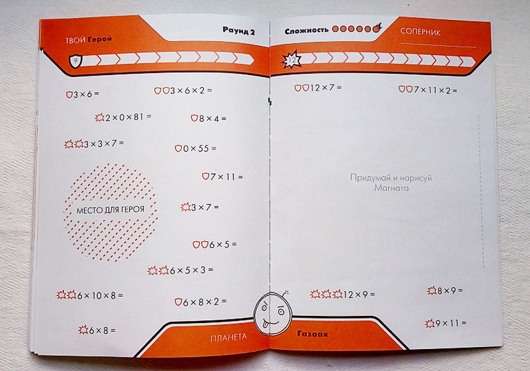 На первой странице пособия три героя и место для четвертого, которого можно нарисовать. Ребенок выбирает или рисует себе героя, вырезает его и отправляется побеждать монстров и попутно таблицу умножения!)