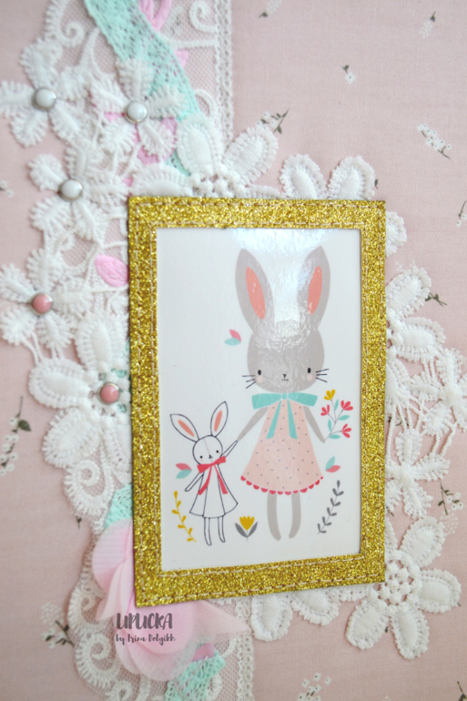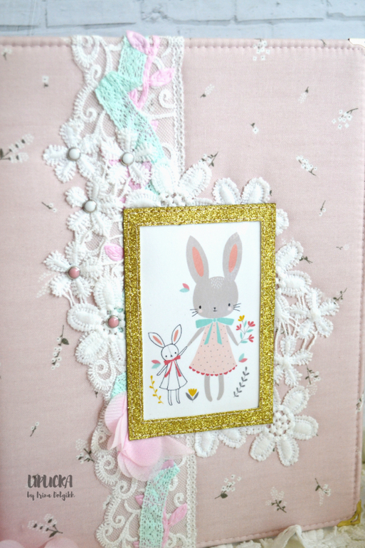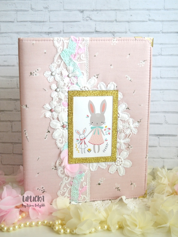 Размер 20*27 см, мягкая обложка обтянута 100% хлопком, закрывается на скрытые магниты. Обложка украшена кружевом белого, розового и мятного цветов, а так же чудесной зайкой в золотой блестящей рамочке.