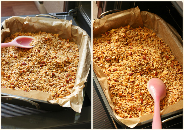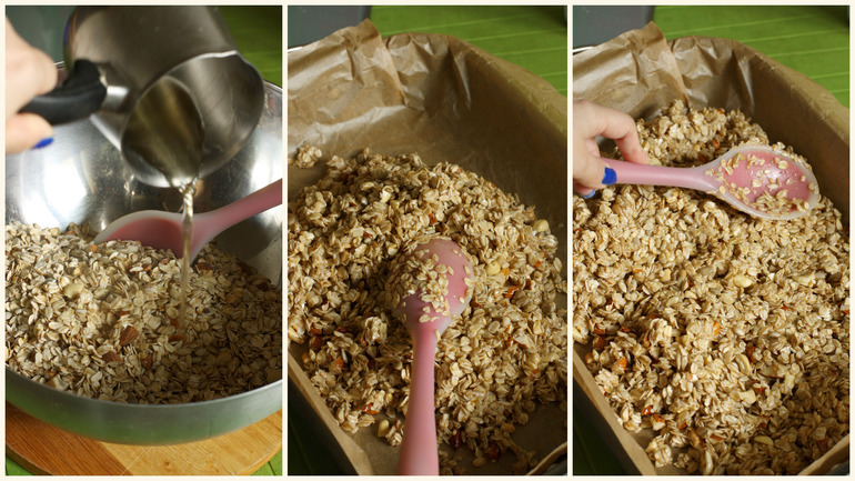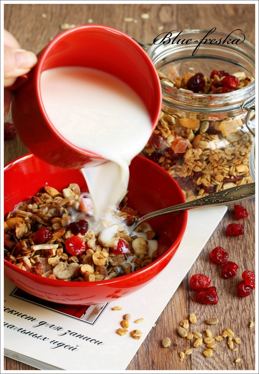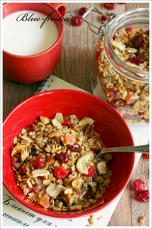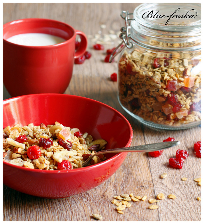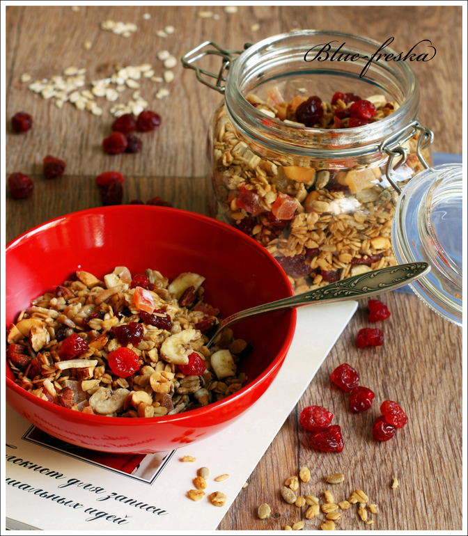 Ещё один мой любимый завтрак, после этого , в том посте с лёгкой руки Светуни Светлая , я решила запечь гранолу) Невероятно вкусная хрустящая, совершенно универсальная в ингредиентах, она теперь частый гость у нас на завтрак, когда мне лень варить кашку)) и иногда так, в качестве перекуса. Прелесть гранолы заключается в том, что её можно собрать из того, что более любишь, или что есть под рукой, главные составляющие - это овсяные хлопья, сок или просто вода, немного рафинированного масла, остальное можно менять, как душе угодно, орехи, семена, цукаты, сухофрукты - в любых количествах. Так как настоящая гранола запекается на меду, а по этому поводу у меня пунктик, что мёд нельзя перегревать, я быстро нашла ему замену) И записала все пропорции, для таких же, как я))), если вас не страшит мёд, он кладётся в том же количестве или чуть меньше, т.к. мёд немного слаще.