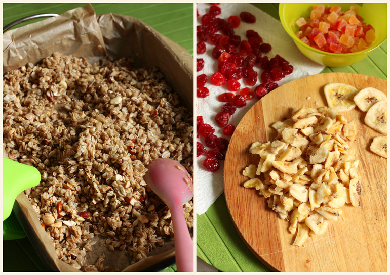 Пеку до золотистого цвета, чуть больше часа, каждые 10 мин. перемешиваю, что бы гранола хорошо и равномерно пропеклась. Параллельно подготавливаю сухофрукты, мою, сушу, режу крупные ягодки, на более удобные кусочки. Банановые чипсы ломаю, с цукатами ничего не делаю)))
