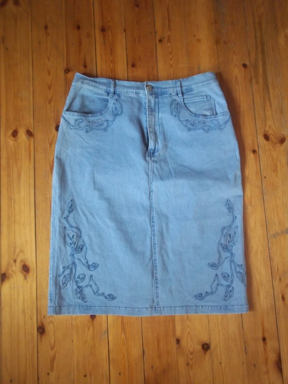 16) Джинсовая юбка,ПОТ-40 см, длина-63 см, хорошо тянется, 120 руб