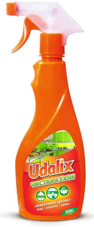 Комплексный очиститель Udalix предназначен для мытья и чистки плит, моек, кранов наружных поверхностей воздухоочистителей, кухонной мебели мебели из дерева и полимерных материалов и металлических изделий.