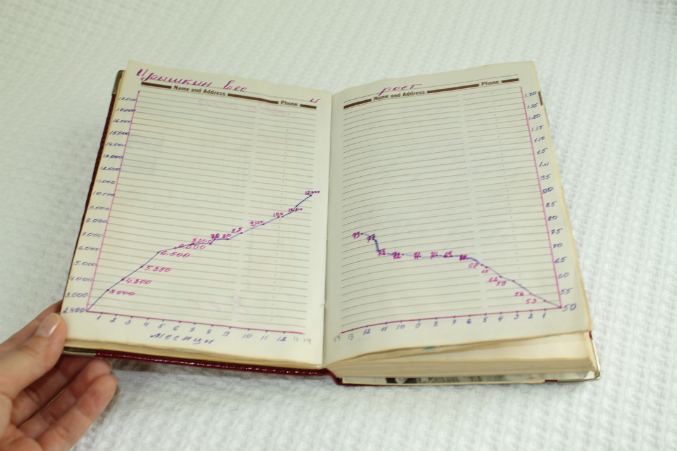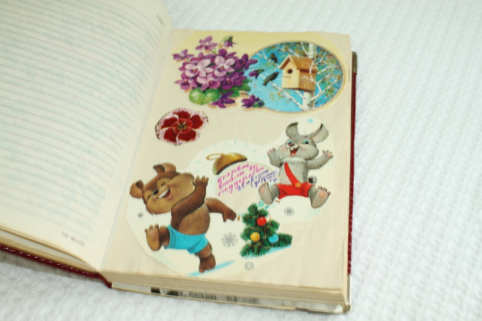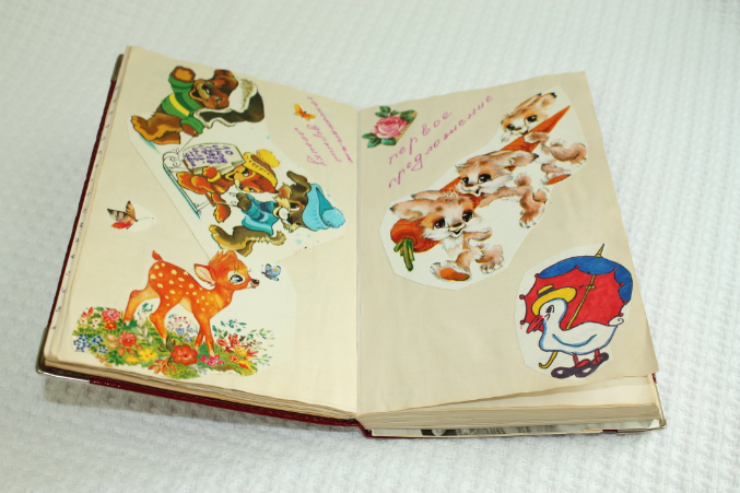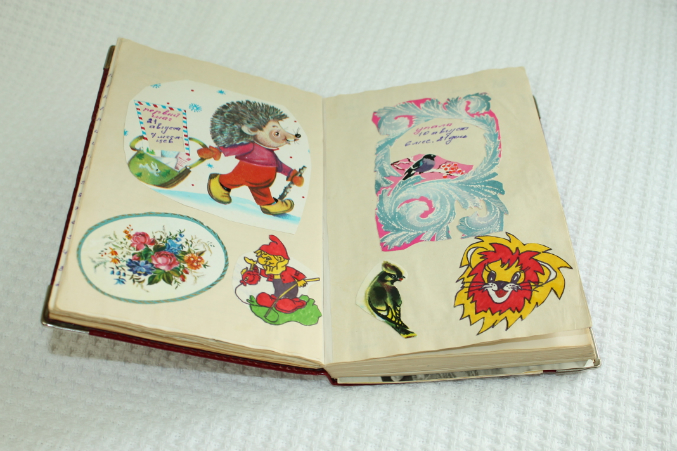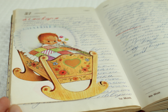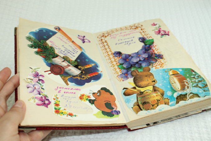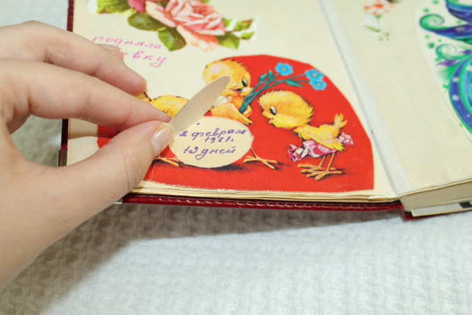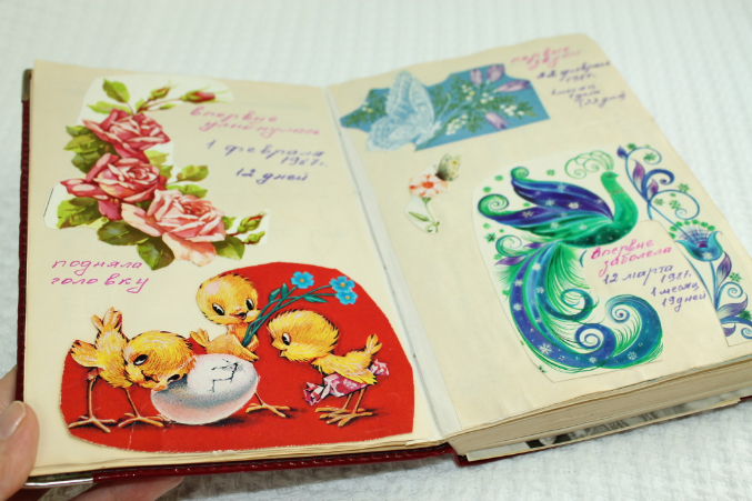 В нем есть все данные когда и где я родилась, вес, рост, родители. Есть таблички рост, вес до года. На протяжении года мама описывала в нем каждый мой день...Что я делала, как спала, достижения, прогулки и много, много всего интересного...Я периодически его перечитываю с огромным удовольствием. Он мне очень дорог! В качестве декора мама использовала советские открытки. В те времена еще наверное и не знали о скрапе, поэтому делали, как сердце велело...Помню в лет 6-7 я с огромным удовольствием открывала блокнотик и рассматривала открыточки с окошками...
