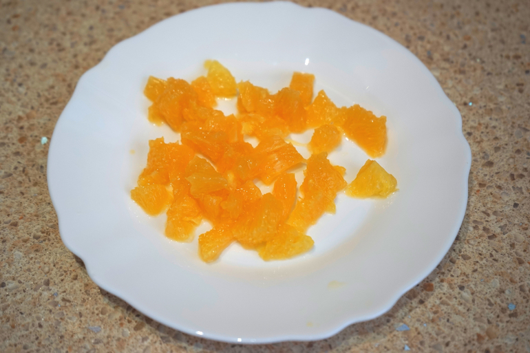 Апельсины очистить от кожуры, удалить междолевые перегородки.