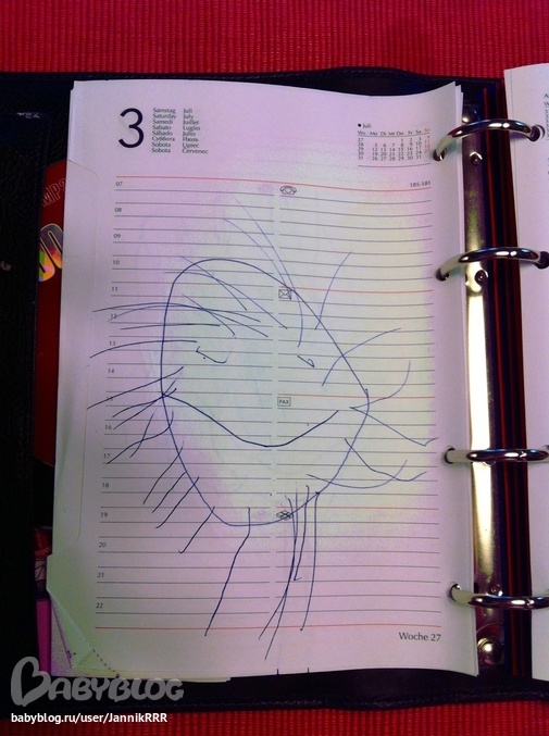 А тут я без ушей!:) и, к стати, на рисунке не я одна, кружочек на моем животе вовсе не пупок! Как сказала Соня, что это она у меня в животике! :) Наш папа просто обалдел!