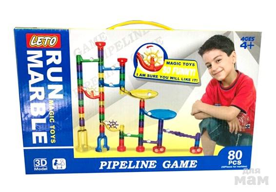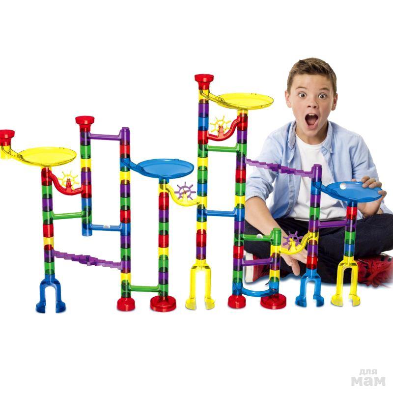- Конструктор состоит из 80 и 120 деталей, изготовленных из высококачественного безопасного пластика: разноцветных желобов, опор, соединений, колес, крышек и шариков