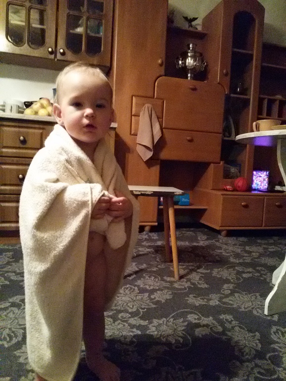 С игрушками не особо играет. Но любит машинки и в тряпочки кого нибудь завернуть и в коляске катать. Ещё любит на себя навешать что попадется и ходить. Любит на голову тряпки - шапки одевать. Короче наряжается.