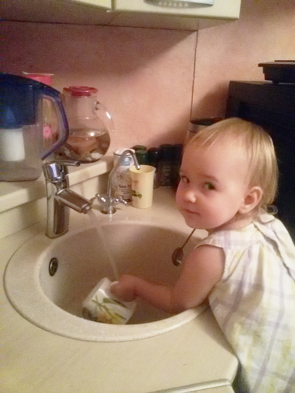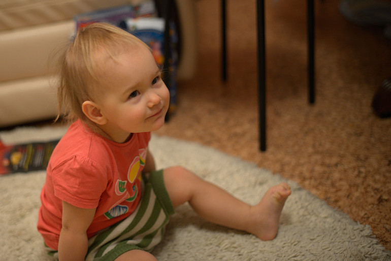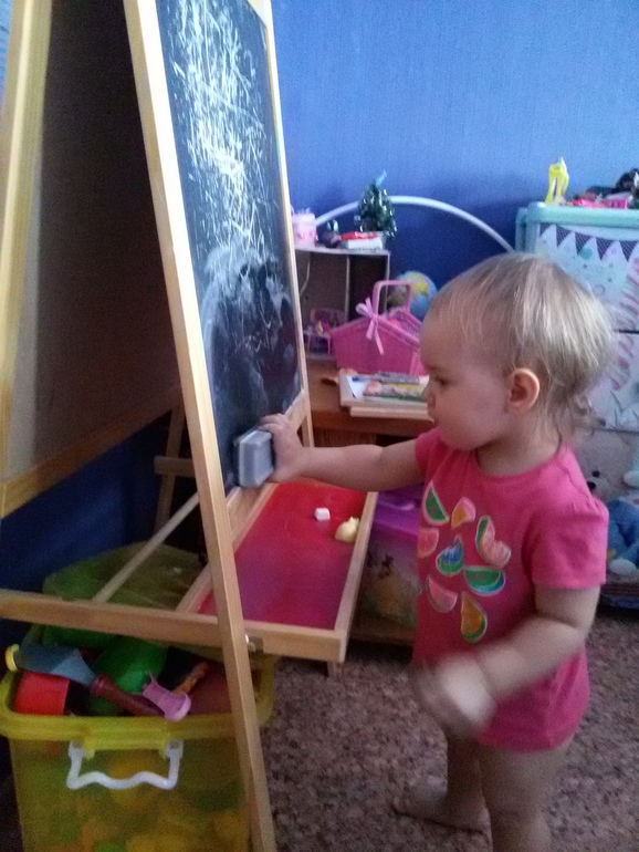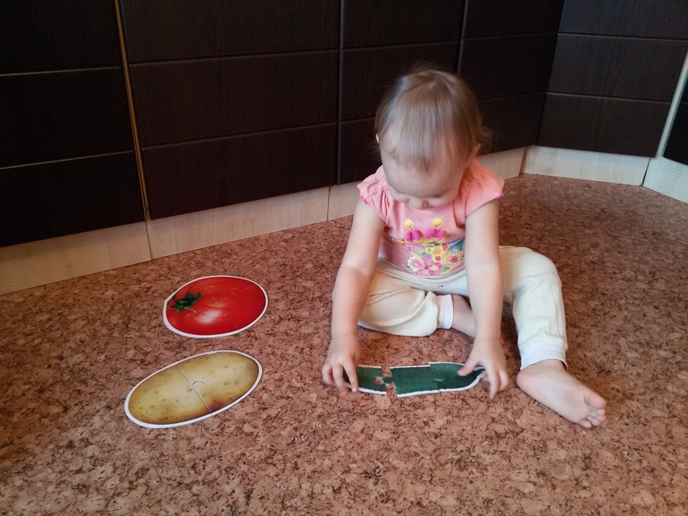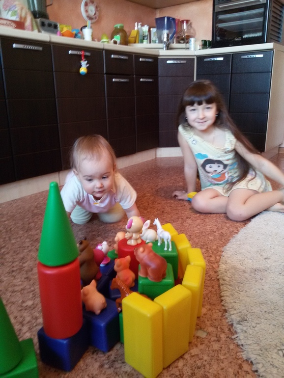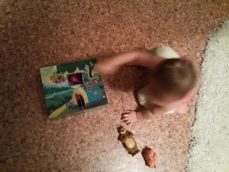 Влада начала активно играть сама с игрухами. Строит из кубиков, конструктора, собирает сама пазлы из 4-5 элементов. Нравится. Может пол часа просидеть с ними)