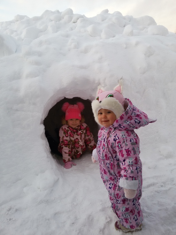 Наши снежные домики. Папа сделал целый снежный городок. Карина любит играть там.