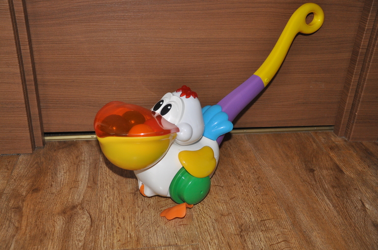 4) Музыкальный пеликан-каталка. Во время движения поет песню, открывает клюв и выплевывает шарики. Дно поцарапано, т.к играли всего один раз на уличной плитке, больше не пользовались - 800р.