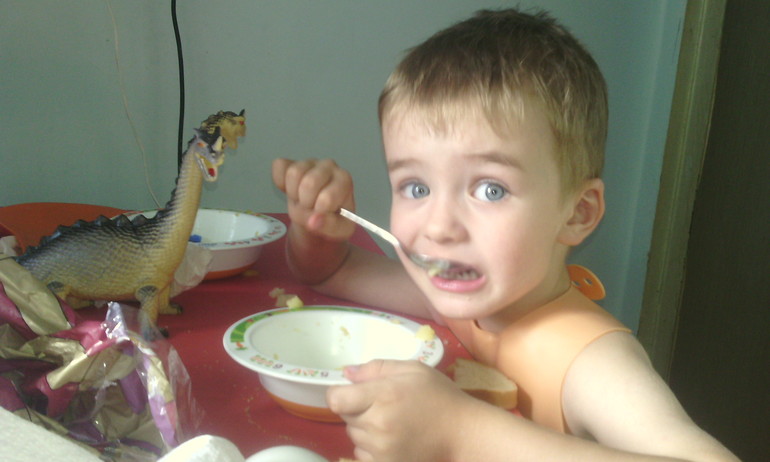 Ваня ест со своим драконом,которого купили после посещения Палеонтологического музея.