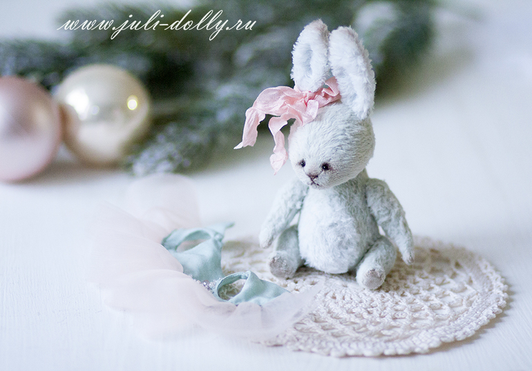Тедди зайка. Нежная, сшитая из вискозы ручного окрашивания, цвет серо-голубой. Девочка набита опилками, утяжелена гранулятом, ручки, ножки, голова на шплинтах. Малышка ростом 14 см.
