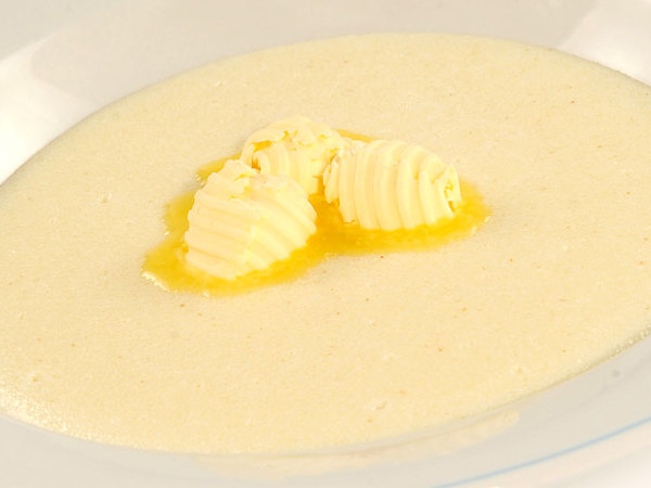 Влить в сотейник воду и сок, довести до кипения, постоянно помешивая ввести тонкой струйкой манку. Варить 2 мин. Накрыть сотейник полотенцем, поставить в теплое место на 15 мин.