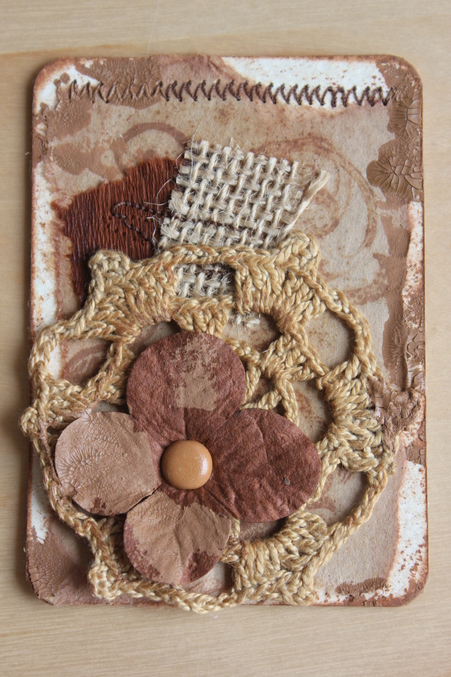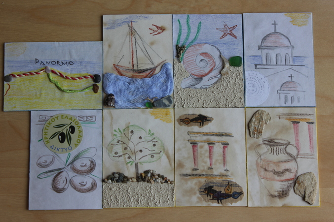 Мои первые выстраданные АТС-ки были сделаны после нашего отпуска в Греции на о. Крит. В каждой АТС-ке есть что-то привезенное с этого острова (камушки, осколки от ракушек, засушенные водоросли, омытые водой стеклышки, настоящий кусочек билетика со штампиком в церковь, бумажка с бутылки оливкого масла, бумажки с дельфинчиками с фресок)! И немного описания!